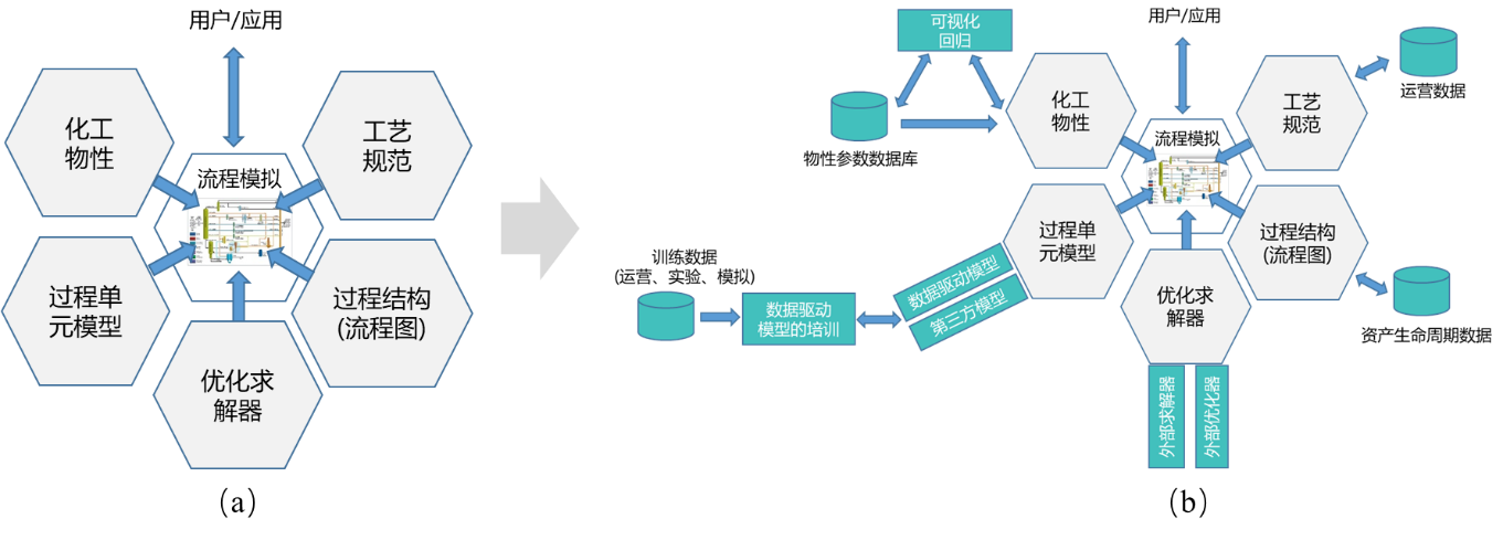 化工流程模擬軟件同樣向平臺化發(fā)展。化工流程模擬軟件應(yīng)用于工藝設(shè)計(jì)、虛擬開車、操作員培訓(xùn)、生產(chǎn)優(yōu)化等工廠全生命周期。經(jīng)過40多年發(fā)展,領(lǐng)先供應(yīng)商的產(chǎn)品已經(jīng)集成穩(wěn) 態(tài)模擬與動態(tài)模擬、集成煉油模擬與化工模擬,主要包括5大功能模塊,即工藝規(guī)范、過程結(jié)構(gòu)(流程圖) 、優(yōu)化求解器、過程單元模型和化工物性,如圖2(a所示,并通過CAPE- OPEN軟件接口標(biāo)準(zhǔn)促進(jìn)了通用流程模擬軟件平臺與單元模型、熱力學(xué)模型組件間的互操作。未來,化工流程模擬平臺軟件的5大模塊將進(jìn)一步融合生產(chǎn)實(shí)時數(shù)據(jù)、實(shí)驗(yàn)數(shù)據(jù)、資產(chǎn)生命周期數(shù)據(jù),進(jìn)一步集成第三方求解器、優(yōu)化器、大數(shù)據(jù)模型、專用反應(yīng)器模型、物性數(shù)據(jù)庫等,為打造石化工藝數(shù)字孿生提供平臺化支撐,如圖 2(b)所示。