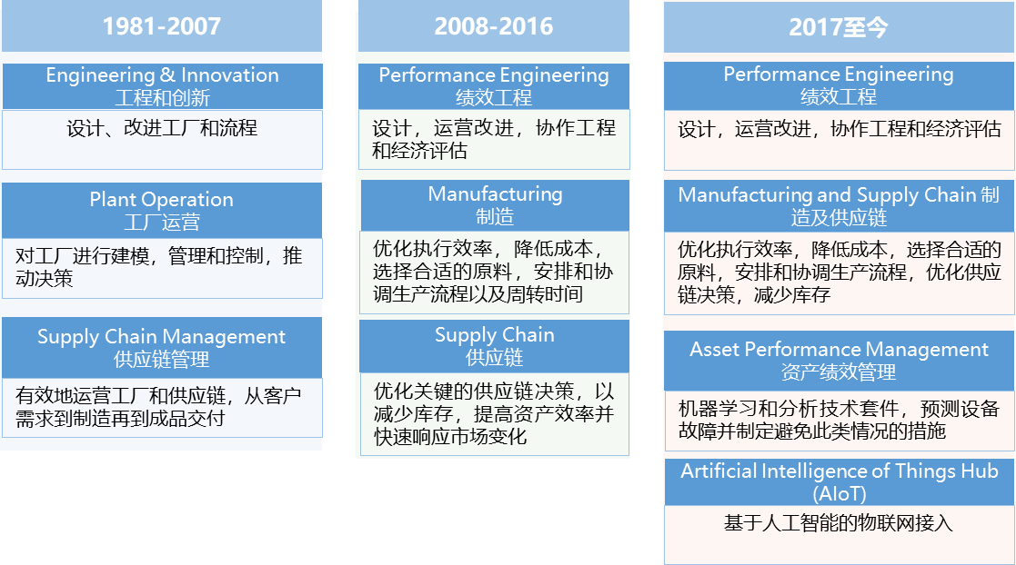 并購發(fā)展階段:從 1996 年起,艾斯本收購了超過 25 個領(lǐng)域中最優(yōu)秀的公司,打造了涵蓋績效工程、制造與供應(yīng)鏈、資產(chǎn)績效管理三大類軟件的產(chǎn)品線,廣泛應(yīng)用于能源、化工、制藥、工程設(shè)計(jì)以及其他采用化學(xué)工藝生產(chǎn)產(chǎn)品的行業(yè),如圖 3 所示。這與艾斯本從流程模擬、優(yōu)化到人工智能的業(yè)務(wù)發(fā)展邏輯保持同步。2021年 10 月,艾默生以 60 億美元現(xiàn)金獲得艾斯本55% 的多數(shù)股權(quán),并將旗下 OSI 公司的電力軟件和地質(zhì)建模軟件業(yè)務(wù)并入艾斯本業(yè)務(wù)中。