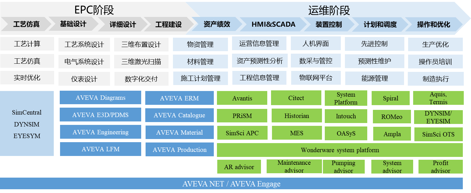施耐德于2014年收購英維斯(Invesys),2017 年反向收購劍維,并將英維斯的業(yè)務(wù)與劍維整合。原來英維斯的軟件,包括用于化工流程模擬的 PRO/II、用于換熱設(shè)備和網(wǎng)絡(luò)優(yōu)化的HEXTRAN、用于動態(tài)過程模擬的 DYNSIM、用于在線實(shí)時優(yōu)化的ROMeo等,現(xiàn)在都集成在劍維品牌下,形成了工程設(shè)計(jì)集成平臺AVEVA E3D、IE&D、流程模擬平臺軟件、資產(chǎn)績效管理套件,提供從工程設(shè)計(jì)、工程建設(shè)、數(shù)字化交付到生產(chǎn)運(yùn)營全生命周期的解決方案,如圖 4 所示。