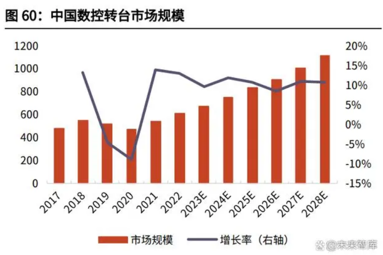 大陸及中國臺灣地區(qū)生產(chǎn)廠家生產(chǎn)的中低檔數(shù)控轉(zhuǎn)臺占據(jù)了我國大部分的轉(zhuǎn)臺 市場;少部分市場由美國、德國、日本等國家公司生產(chǎn)的高端產(chǎn)品所占據(jù)。內(nèi)地 最具競爭力的數(shù)控轉(zhuǎn)臺生產(chǎn)廠家是煙臺環(huán)球機(jī)床附件集團(tuán)有限公司,該廠家的產(chǎn) 品體系完備,規(guī)格齊全,種類繁多,且設(shè)計開發(fā)和制造方面具備豐富的經(jīng)驗。中 國臺灣地區(qū)的德川機(jī)械股份有限公司是專業(yè)數(shù)控轉(zhuǎn)臺生產(chǎn)廠商之一。國外有日本 的 NIKKEN(日研)、德國 Peiseler、美國 HASS 公司等專業(yè)的生產(chǎn)廠家。國內(nèi) 生產(chǎn)的數(shù)控轉(zhuǎn)臺產(chǎn)品與國外的產(chǎn)品相比,在精度、速度及可靠性等參數(shù)上仍與國 外數(shù)控轉(zhuǎn)臺存在一定差距。2021 年中國數(shù)控轉(zhuǎn)臺市場銷售收入達(dá)到了 5.43 億美元,據(jù) QYResearch 預(yù)計, 2028 年可以達(dá)到 11.17 億美元。從產(chǎn)品類型及技術(shù)方面來看,單軸占有重要地位,2021 年份額達(dá)到 89.43%, 銷量達(dá)到 58678 臺,而雙軸由于價格較貴,從 2021 年銷量上來看僅為單軸的 1/9,達(dá)到 6935 臺,但銷售額超過單軸的 1/3,達(dá)到 1.44 億美元。預(yù)計未來單 軸和雙軸的比例穩(wěn)定,在 2028 年,單軸的銷量將達(dá)到 104280 臺,而雙軸達(dá)到 13671 臺。從產(chǎn)品市場應(yīng)用情況來看,與立式數(shù)控機(jī)床配套使用的數(shù)控轉(zhuǎn)臺最多,接近 60%,在 2021 年達(dá)到 38816 臺,而臥式和龍門分別達(dá)到 19330 臺與 7467 臺。未來增長速度最快的為龍門數(shù)控機(jī)床,2022-2028 年的 CAGR 達(dá)到 9.69%。目 前中國主要廠商包括旭陽國際精機(jī)、寶嘉誠、德川機(jī)械、潭佳精密科技和潭興精 工等,2021 年 Top5 廠商份額占比超過 50%。