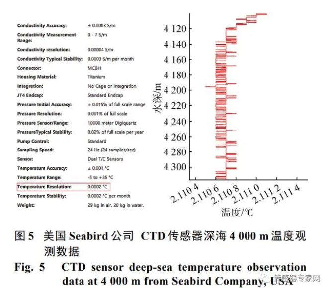 作為世界上最主流的 CTD 傳感器制造商美國(guó) Seabird 公司的產(chǎn)品, 其溫度測(cè)量分辨率為0.000 2℃, 電導(dǎo)率測(cè)量分辨率為 0.000 05 s/m, 如圖 5 所示, 該型傳感器在4000 m 水深情況下, 已經(jīng)無(wú)法很好地分辨微小的溫度和鹽度變化。針對(duì)此, 我國(guó)全海深科學(xué)考察所必備的全海深 CTD傳感器必須立足于自主研發(fā)。