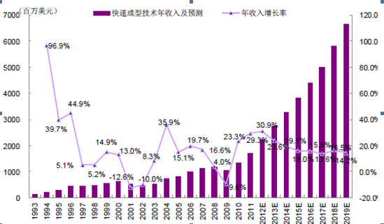 花旗銀行最新發(fā)布了一份研究報告3,將3D 打印產(chǎn)業(yè)視作將改變世界的十大技術發(fā)明,并預計3D 打印產(chǎn)業(yè)將在航天、整形等高附加值、小體量的產(chǎn)業(yè)領域率先爆發(fā)。專業(yè)研究機構Wohlers 發(fā)布的報告預期,3D 打印產(chǎn)業(yè)未來仍將持續(xù)較快地增長,到2015 年,包含設備制造和服務在內(nèi)的產(chǎn)業(yè)總產(chǎn)值將達到31 億美元,2019 年將超越65 億美元。
