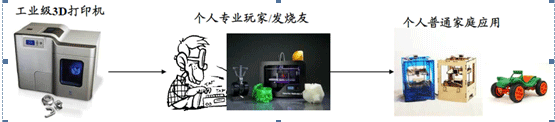 工業(yè)生產(chǎn)方式的變革與消費者行為存在交互影響,消費需求的轉(zhuǎn)變往往能推動工業(yè)的創(chuàng)新變革,而工業(yè)生產(chǎn)方式根本轉(zhuǎn)變之后又反過來使消費習慣固定。近年來,國外消費者個性化定制的訴求日益強化,現(xiàn)代工業(yè)流水線生產(chǎn)模式引以為傲的標準化產(chǎn)品越來越難調(diào)眾味。3D 打印這種基于網(wǎng)絡平臺,以3D 打印機為生產(chǎn)終端的技術,恰恰能滿足大眾(特別是不具備產(chǎn)品開發(fā)能力的消費者)的多樣化需求。下一步,也是西方國家正在做的事情,通過傳媒宣傳、體驗館展示在消費者群體中推廣新技術,影響消費者選擇,使3D 打印加速形成新興產(chǎn)業(yè)。