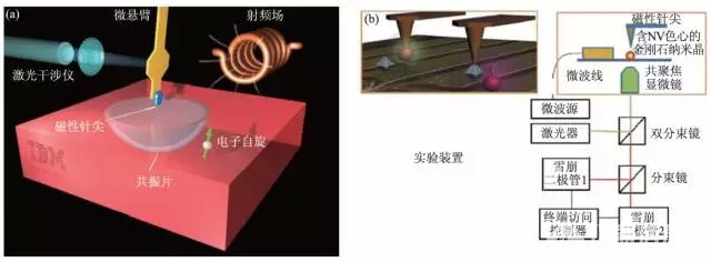 圖1 (a)MRFM原理圖;(b)基于金剛石NV色心的AFM光探測磁共振技術原理圖