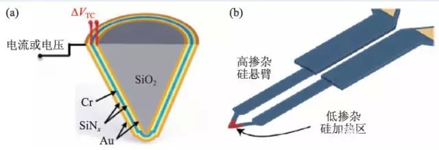 圖2 (a)集成熱電偶和導電層的SThM探針原理圖(ΔVTC 為熱電勢);(b)HT-AFM的“熱源”探針的基本原理圖