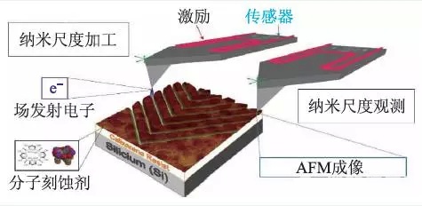 在微納米尺度上對微懸臂的激勵和檢測方式是多種多樣的, 可利用如壓電效應、電容效應、熱雙金屬片效應、壓阻效應等。目前,利用微納加工手段將微懸臂的激勵裝置和形變檢測裝置都直接集成一體,成為自激勵、自檢測式陣列化探針,它們的應用大大提高了SPL 技術的通量,使得實現高效率大面積的納米級高分辨率刻蝕成為了可能。