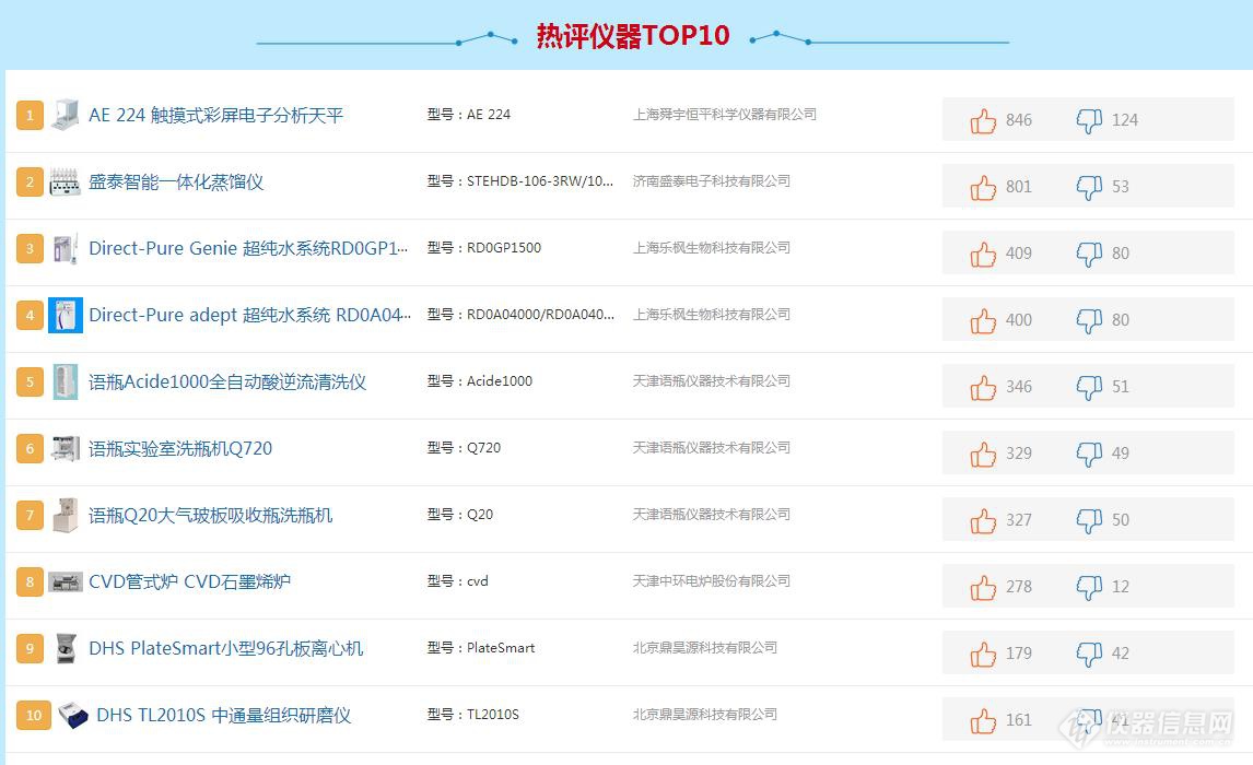 隨著申報(bào)儀器數(shù)量的不斷增加,相關(guān)儀器的“入圍評(píng)審”正式啟動(dòng)。通過(guò)初審的68臺(tái)儀器開(kāi)始接受用戶的入圍評(píng)議。在活動(dòng)專題網(wǎng)站上,用戶通過(guò)采取投票和評(píng)論的形式,對(duì)儀器展開(kāi)入圍評(píng)審。截止日前,剔除惡意刷票后,收到用戶有效投票7686張,評(píng)論591條。
