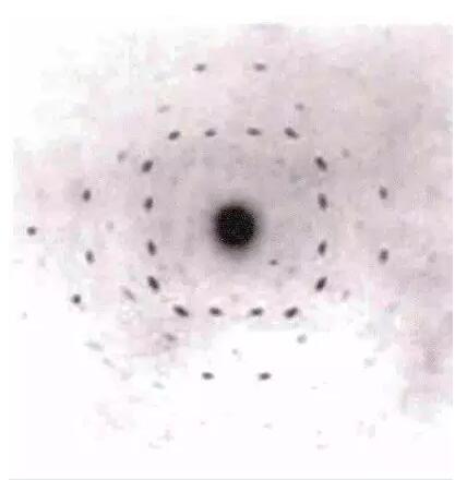 大約在 1912 年 1 月底,德國物理學(xué)家索末菲 (A. Sommerfeld,1868~1951) 的一位學(xué)生厄瓦爾德 (P. Ewald) 在準(zhǔn)備博士論文過程中,為研究光波在晶格中 的行為而尋找數(shù)學(xué)處理方法時遇到了一些困難,為此 他向勞厄 (M. Laue)( 見圖 6) 請教。在他們的探討中勞 厄了解到晶體中原子間的距離很小,與可見光的波長 相比大概只有波長的 1/500 或 1/1000。勞厄想到,雖然人工做不出這樣細(xì)的光柵,但自然界中的晶體也許能行。晶體是一種幾何形狀整齊的固體,而在固體平 面之間有特定的角度,并且有特定的對稱性。這種規(guī)律是構(gòu)成晶體結(jié)構(gòu)的原子有次序地排列的結(jié)果。一層原子和另一層原子之間的距離大約是 X 射線波長的大小。如果這樣,晶體應(yīng)能使 X 射線衍射。勞厄醞釀出一個實驗:把晶體當(dāng)作一個三維光柵,讓一束 X 射 線穿過,由于空間光柵的間距與 X 射線波長的估計值在數(shù)量級上近似,可期望觀察到衍射譜。雖然勞厄的想法受到索末菲和維恩 (W. Wien) 等著名物理學(xué)家的懷疑,但是在索末菲的助手弗里德里希 (W. Friedrich) 和倫琴的博士研究生克尼平 (P. Knipping) 的支持和參與下,他們終于成功地觀察到 X 射線透過硫酸銅后的衍射斑點(diǎn)。通過改進(jìn)儀器設(shè)備數(shù)周后他們照出更為清晰的 ZnS、PbS 和 NaCl 等晶體的 X 射線衍射圖 ( 如 圖 7 所示 )。