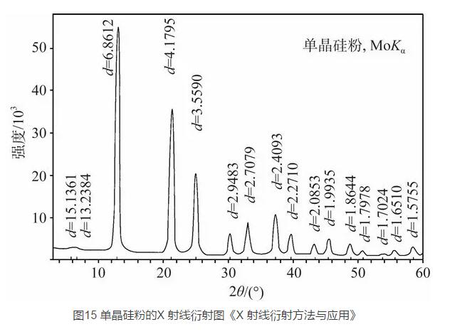 現(xiàn)代的 X 射線衍射儀的原理如圖 14 所示,從 X 射線管射出的 X 射線經(jīng)準(zhǔn)直后照射在樣品上;在測量 過程中樣品在計算機(jī)的控制下勻速轉(zhuǎn)動,其入射角以 一定的角速度變化,測量衍射光強(qiáng)的探測器則以 2 倍于入射角的角速度變化;由此來記錄衍射光強(qiáng)隨入射角的變化,從而測出各個晶面間的面間距。圖 15 給 出了比較典型的粉末晶體 Si 的 X 衍射圖,每一個衍射峰對應(yīng)一簇晶面的面間距,通過計算機(jī)與已知晶體的衍射資料庫進(jìn)行比對即可確定樣品是什么晶體,或者發(fā)現(xiàn)新的晶體。