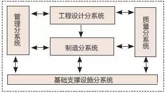 工業企業信息化集成系統的上層是企業(信息化)系統。從企業業務運行角度來分析,企業系統由管理分系統、工程設計分系統、制造分系統、質量保證分系統以及基礎支撐設施分系統5個部分組成,如圖4所示。