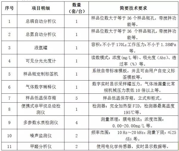 總磷自動分析儀、總氮自動分析儀、液氬氣罐、可見分光光度計、樣品瓶定制標簽機、氣體數字稀釋儀、樣品低溫保存箱自合同簽訂之日起6個月內完成供貨、現場安裝調試和驗收工作;便攜式非甲烷總烴檢測儀、多參數水質檢測儀、噪聲監測儀、甲醛分析儀自合同簽訂之日起3個月內完成供貨、現場安裝調試和驗收工作。