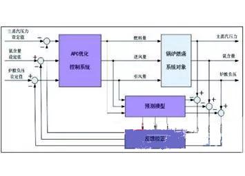 鍋爐的燃燒過程是一個極其復雜的化學過程與物理傳熱過程,鍋爐的燃料量、送風量、引風量的控制具有強耦合、非線性、多變性、大滯后等特點,所以整個燃燒系統(tǒng)的控制必須協(xié)調(diào)控制才能保證鍋爐負荷、壓力、氧量、溫度、負壓的穩(wěn)定。針對鍋爐燃燒系統(tǒng)的這種特殊性,APC優(yōu)化控制系統(tǒng)的研發(fā)集成了多變量自適應控制器、智能仿人工控制策略、預測控制、模糊控制、自動尋優(yōu)、反饋校正等核心技術,真正實現(xiàn)了鍋爐在正常工況與異常工況下的全自動運行。優(yōu)化控制系統(tǒng)輸入輸出原理圖如圖1所示。