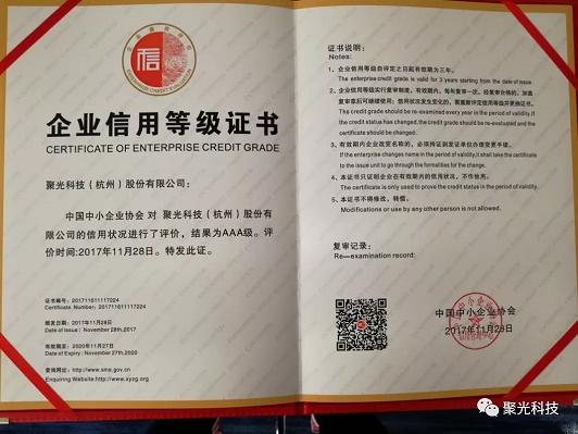 2018年1月12日,國(guó)家商務(wù)信用企業(yè)授牌儀式在杭州召開,聚光科技(杭州)股份有限公司榮獲“企業(yè)信用評(píng)價(jià)AAA級(jí)信用企業(yè)”的榮譽(yù)。授牌儀式由中華人民共和國(guó)國(guó)家發(fā)展和改革委員會(huì)(以下簡(jiǎn)稱國(guó)家發(fā)改委)籌建的中國(guó)中小企業(yè)協(xié)會(huì)舉辦。