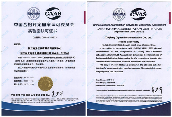 浙江迪元儀表有限公司檢測中心近日獲得由中國合格評定國家認可委員會(簡稱CNAS)授予的認可證書(證書編號:CNAS L10452)。檢測中心的校準能力實現了國際互認,符合國際標準化組織ISO17025所規定的檢測和校準實驗室能力的通用要求。這進一步證明了迪元儀表具備了流量計領域自我校準的先進技術和能力資質,為客戶提供高精度、高標準的流量計產品。