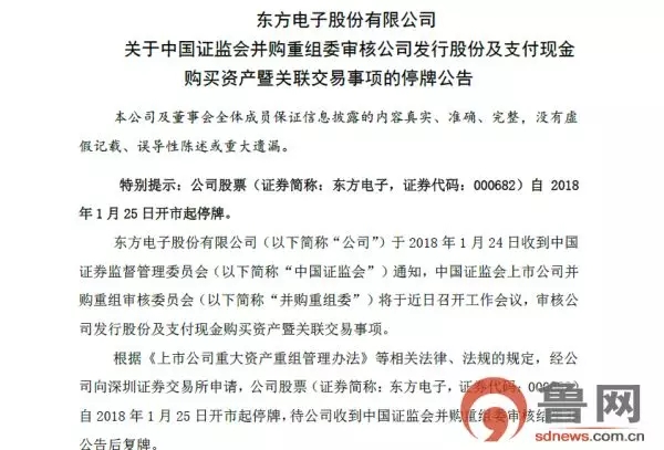 從深圳證券交易所獲悉,東方電子股份有限公司近日收到中國證券監(jiān)督管理委員會(以下簡稱“中國證監(jiān)會”)通知,中國證監(jiān)會上市公司并購重組審核委員會將于近日召開工作會議,審核公司發(fā)行股份及支付現(xiàn)金購買資產(chǎn)暨關聯(lián)交易事項。公司股票自2018年1月25日起已停牌,待收到中國證監(jiān)會并購重組委審核結果并公告后復牌。