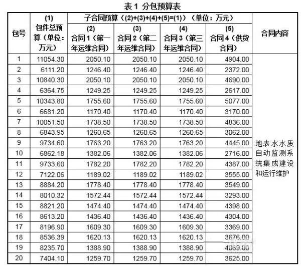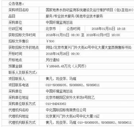 2018年1月31日,中國政府采購網(wǎng)發(fā)布《中國環(huán)境監(jiān)測總站國家地表水自動監(jiān)測系統(tǒng)建設(shè)及運行維護項目(包1至包20)公開招標(biāo)公告》,此項目總預(yù)算為168445.45 萬元,將分為20包,且有些包數(shù)同一廠商不能同時中標(biāo)。