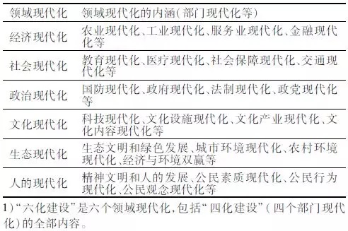 中國復興的建設內容,從“四化建設”擴展到“六化建設”,有可能實現全面復興。因為,從“部門現代化”到“領域現代化”(表2),內涵更豐富,內容更全面,而且可以減少“部門因素”的不利影響。例如,經濟現代化包括農業現代化、工業和服務業現代化等,社會現代化包括教育現代化、醫療和交通現代化等,政治現代化包括國防現代化、政府和法制現代化等,文化現代化包括科技現代化、文化產業和文化內容現代化等。