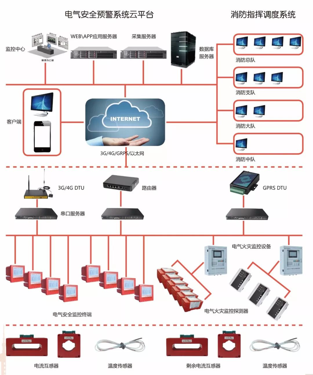依靠電氣安全云平臺(tái)、電氣安全預(yù)警系統(tǒng),監(jiān)控終端、探測(cè)器等,將各監(jiān)測(cè)點(diǎn)的電氣安全預(yù)警、治理數(shù)據(jù)實(shí)時(shí)傳送至系統(tǒng)平臺(tái)數(shù)據(jù)中心。