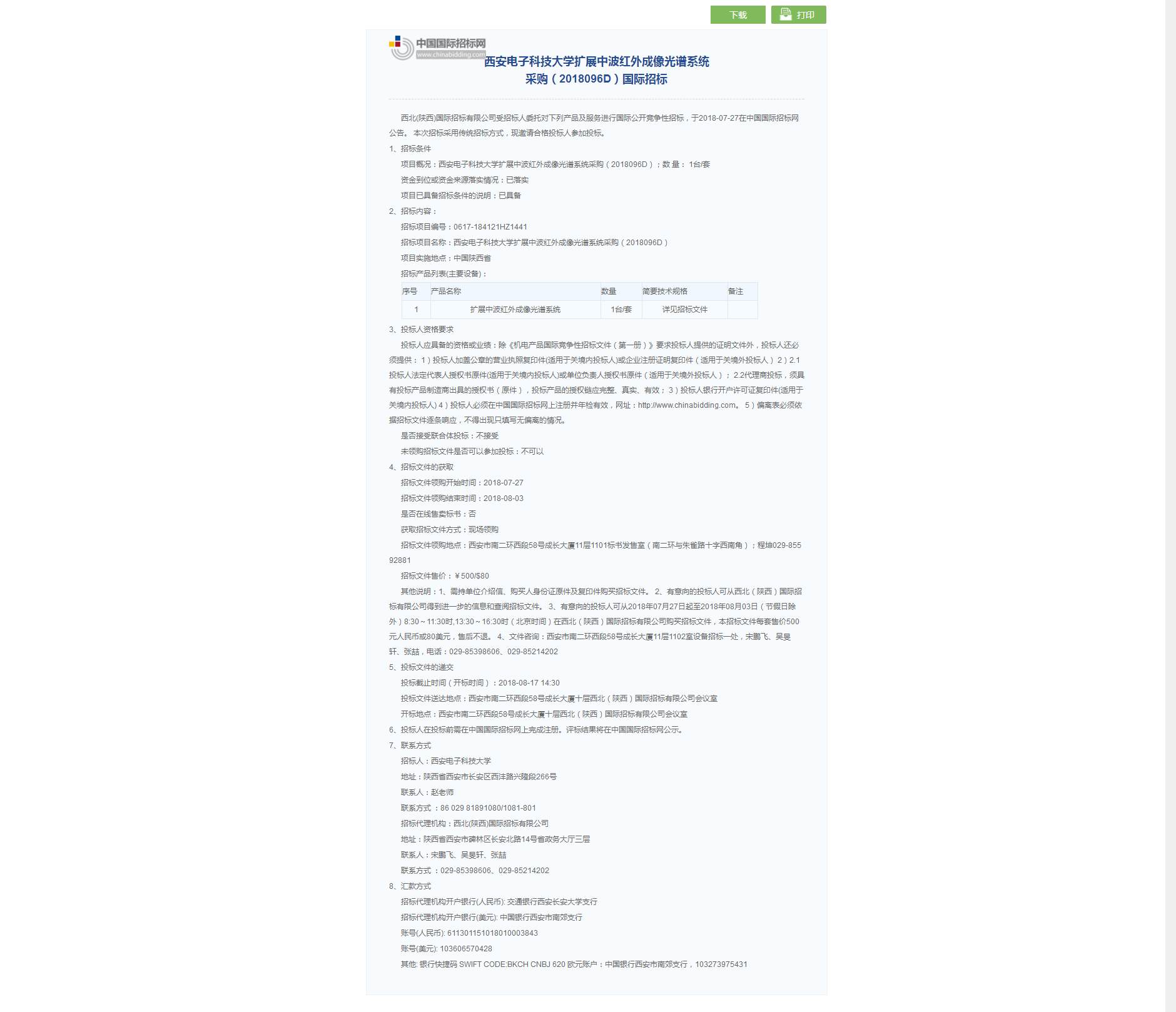 西安電子科技大學擴展中波紅外成像光譜系統(tǒng)采購(2018096D)