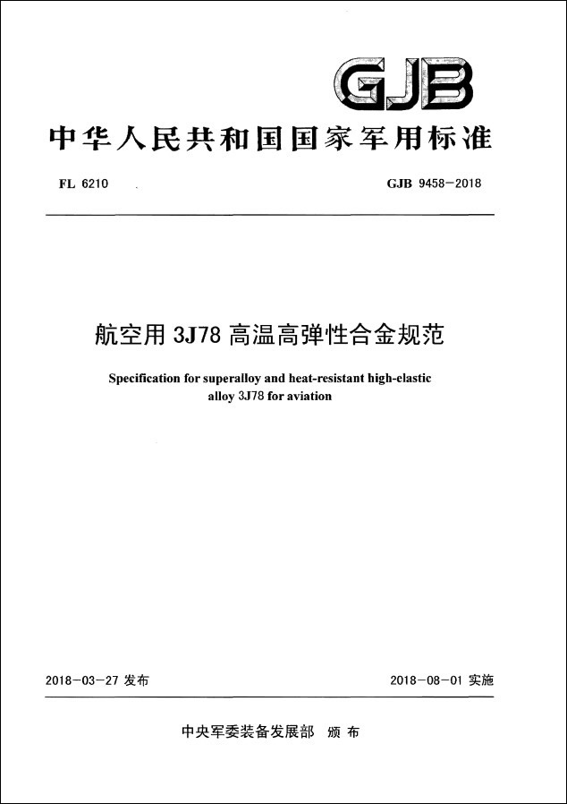 2018年8月1日,由中央軍委裝備發展部頒布的國家軍用標準《航空用3J78高溫高彈性合金規范》正式實施。該標準是以重慶材料研究院為主編單位,聯合撫順特殊鋼股份有限公司、北京航空材料研究院、沈陽黎明航空發動機(集團)有限責任公司、海軍駐洛陽地區航空軍事代表室、冶金工業信息標準研究院等單位共同編制的。重慶材料研究院特種合金部萬紅擔任編制組組長。