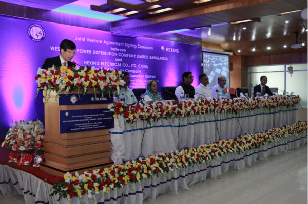 孟加拉國國家能源部長Nasrul Hamid先生等政要一行見證了簽字儀式。海興電力董事長周良璋先生和WZPDCL秘書Abdul Motaleb先生分別代表雙方在協議上簽字,并表示接下來將齊心協力籌備與建設好名為"Bangladesh Smart Electrical Company Limited"(孟加拉智能電力設備有限公司)的合資企業。其中WZPDCL和海興電力分別以51:49的比例認購了新公司的股本。