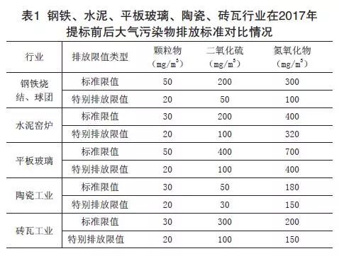 表1為鋼鐵、水泥、平板玻璃、陶瓷、磚瓦行業(yè)在2017年提標(biāo)前后排放標(biāo)準(zhǔn)的對(duì)比情況。
