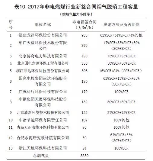 表10給出了參與調(diào)查各會(huì)員企業(yè)2017年新簽合同非電燃煤煙氣脫硝工程處理煙氣量情況,不包括歷史累計(jì)煙氣量。截至2017年底,參與調(diào)查企業(yè)的全國(guó)非電燃煤新簽合同脫硝工程總煙氣量為3830萬(wàn)Nm3/h。