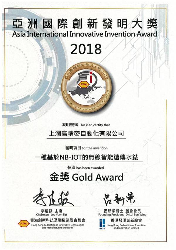 香港創新科技成就大獎是由香港創新科技及制造業聯合總會(簡稱:FITMI)設立的賽事,至今已舉辦八屆,時至今日,香港創新科技成就大獎已經成為香港工業界中一項矚目的年度盛會,往屆主要設置三類別獎項,包括“卓越制造業成就大獎”、“創新科技成就大獎”以及“新一代成就大獎”,用以表揚業界中不同的杰出企業及精英,為了進一步推動香港乃至亞洲地區的創新發明發展,今年特聯合香港發明創新總會及中國發明協會首度舉辦了“2018亞洲創新發明大獎暨展覽會”,得到香港生產力促進局大力支持,以及44家包括香港政府知識產權署、香港各大大專院校及企業等機構支持。福建上潤精密儀器有限公司攜最新研發成果“基于NB-IoT的無線智能遠傳水表”亮相大賽即獲得廣泛關注,其突破傳統的產品結構、精準的測量與傳輸、更益于用水健康等多方面優勢,在賽事中力拔頭籌,獲得亞洲國際創新發明大獎最高獎——金獎。