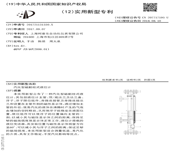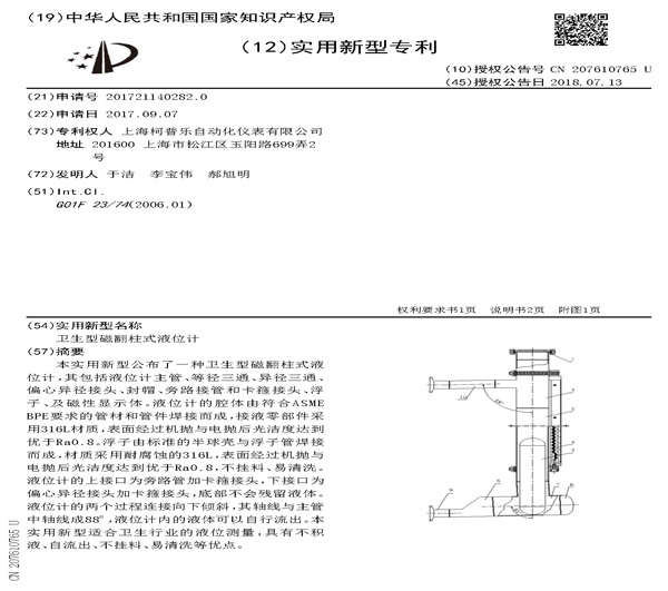 上海柯普樂自動化儀表有限公司最近獲得了三個型號液位計產(chǎn)品的實用新型專利授權(quán),分別是:衛(wèi)生型、汽化型和低溫低密度型。這三款產(chǎn)品通過獨特的設(shè)計、材料及工藝滿足在不同行業(yè)的特殊工藝要求,如:食品及飲料、醫(yī)藥、液化氣、乙烯制造。此三項專利申請中共有11項權(quán)利要求得到保護(hù),日前已收到了國家知識產(chǎn)權(quán)局的授權(quán)通知,預(yù)計將在一個月左右收到專利證書。專利申請的通過,使得知識產(chǎn)權(quán)得以保護(hù),提升了柯普樂的品牌形象,同時也鼓勵柯普樂人更加深入地貼近客戶和了解各種應(yīng)用。