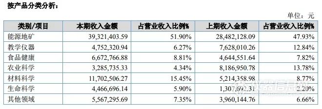 依據(jù)其主要銷售領(lǐng)域的不同,可以分為能源地礦、材料科學(xué)、食品健康、農(nóng)業(yè)、教學(xué)等幾大類,其中能源地礦 3,932.14 萬元、材料科學(xué) 1,170.25 萬元、食品健康領(lǐng)域?qū)崿F(xiàn) 667.28 萬元,教學(xué)儀器為 475.23 萬元、生命科學(xué) 446.67 萬元、農(nóng)業(yè)科學(xué)為 328.57 萬元、其他領(lǐng)域合計(jì)共 556.73 萬元。在宏觀經(jīng)濟(jì)整體放緩的經(jīng)濟(jì)形勢下,公司在報(bào)告期內(nèi)仍然實(shí)現(xiàn)銷售收入的快速穩(wěn)定增長。