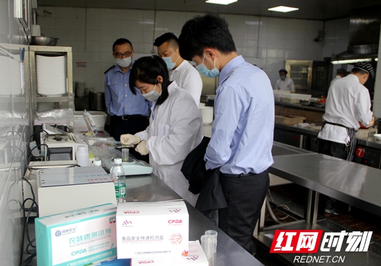 5月2日,正值五一旅游高峰期間,為保障景區食品安全,廣東中檢達元檢測技術有限公司(簡稱中檢達元)受武陵源區市場監管局委托,在武陵源核心景區袁家界阿凡達餐廳的廚房內,檢測餐廳內的蔬菜、肉類、腌制類食品原材料。中檢達元專業檢測人員運用便攜式快檢設備進行快速抽檢,重點檢測農藥殘留、瘦肉精、亞硝酸鹽等指標,并對檢測的各個項目及合格情況當場實時公示。