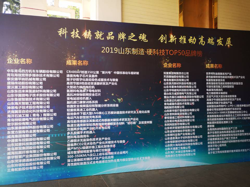 近日,“制造業高質量發展2019山東論壇暨山東制造·硬科技TOP50品牌榜發布儀式”在濟南隆重召開,煙臺東方威思頓電氣有限公司“電力物聯網末端感知”項目上榜。