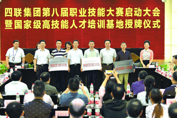 近日,四聯(lián)集團(tuán)舉行國家級高技能人才培訓(xùn)基地授牌儀式,四聯(lián)集團(tuán)黨委副書記、紀(jì)委書記、工會主席黃治華、副總經(jīng)理陳紅兵,四川儀表工業(yè)學(xué)校黨委書記柴彬堂為三個基地授牌。