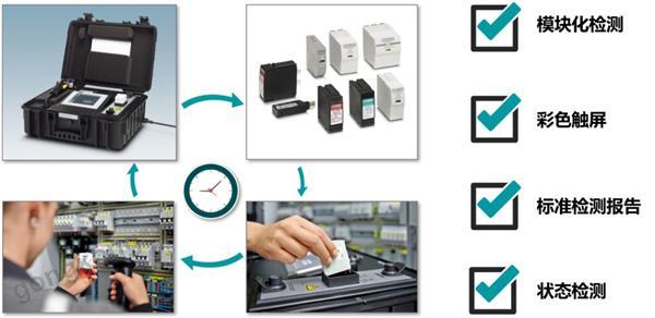 以小菲為代表的全球知名電涌保護器生產商會向客戶提供可攜帶的檢測設備,對現場的SPD進行質量檢查。這一類檢測設備內置微型沖擊發生器,能夠較為精準地判斷產品的好壞。菲尼克斯電氣Checkmaster2產品能夠對菲家所有可插拔電涌保護器進行現場檢測,方便快捷。