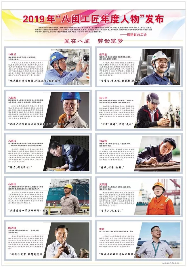 每一位入選的工匠身上都具備精湛技藝、卓越匠心、家國情懷,是新時代勞動者的典范。10名“八閩工匠年度人物”候選人主要來自電力、制造、石油化工、工藝制造等行業,涵蓋鉗工、電工、焊工、手工等工種,并兼顧了不同性別、民族,具有充分的廣泛性、代表性、示范性。