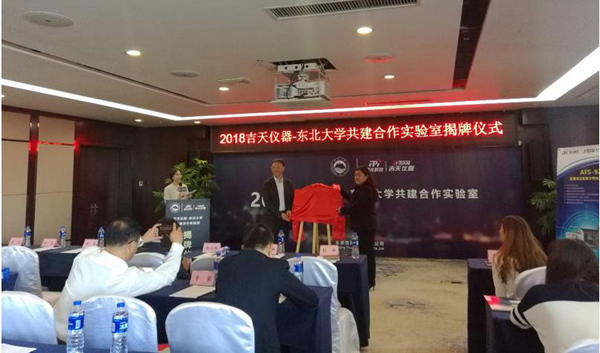 在幾位領(lǐng)導(dǎo)發(fā)言過后,東北大學(xué)副校長(zhǎng)王建華教授、北京吉天儀器有限公司董事長(zhǎng)彭華女士上臺(tái)為“吉天儀器-東北大學(xué)共建合作實(shí)驗(yàn)室”揭牌,宣布雙方共建合作實(shí)驗(yàn)室正式成立,開啟了雙方強(qiáng)強(qiáng)聯(lián)手共同推動(dòng)產(chǎn)業(yè)技術(shù)水平提升的新征程。共建合作實(shí)驗(yàn)室的成立為進(jìn)一步落實(shí)產(chǎn)學(xué)研合作提供了更好的交流平臺(tái),共建雙方借此平臺(tái)科研互補(bǔ)、共謀發(fā)展,以期發(fā)揮雙方優(yōu)勢(shì)力量。