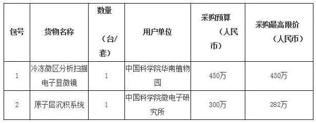 中國科學院發布2019年儀器設備部門集中采購項目(第二批)公開招標公告,預算6235萬采購10套儀器設備,包括冷凍微區分析掃描電子顯微鏡、場發射球差校正透射電子顯微鏡、透射電子顯微鏡、納升液相-四級桿-高分辨質譜儀等。
