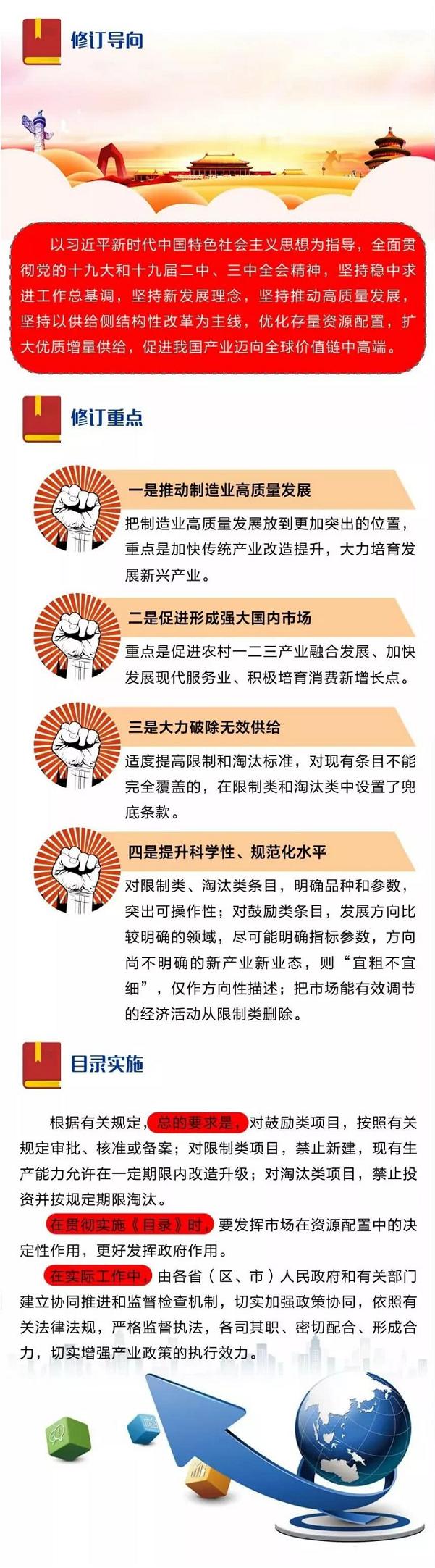 《目錄(2019年本)》共涉及行業48個,條目1477條,其中鼓勵類821條、限制類215條、淘汰類441條。與上一版相比,從行業看,鼓勵類新增“人力資源與人力資本服務業”、“人工智能”、“養老與托育服務”、“家政”等4個行業,將上一版“教育、文化、衛生、體育服務業”拆分并分別獨立設置,限制類刪除“消防”行業,淘汰類新增“采礦”行業的相關條目;從條目數量看,總條目增加69條,其中鼓勵類增加60條、限制類減少8條、淘汰類增加17條;從修訂面看,共修訂(包括新增、修改、刪除)822條,修訂面超過50%。