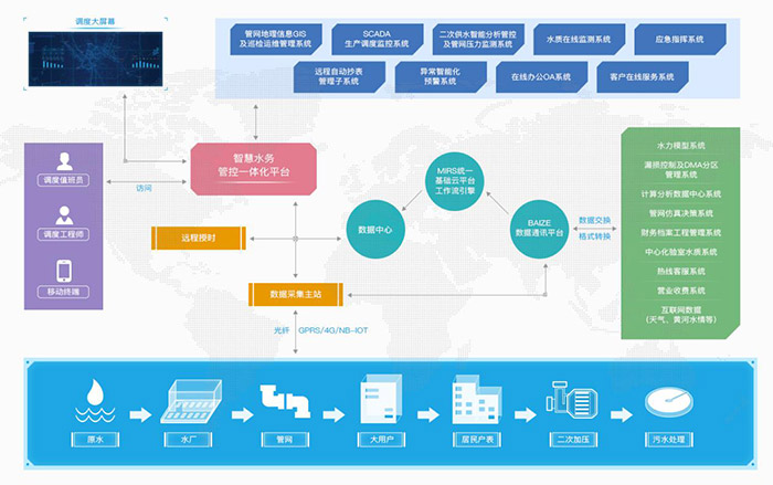 該平臺(tái)結(jié)合水務(wù)行業(yè)需求及水務(wù)信息化發(fā)展趨勢(shì),以水務(wù)數(shù)據(jù)為核心、物聯(lián)網(wǎng)為基礎(chǔ),以WiFi、4G、NBIOT全覆蓋,寬帶通信為高速信息通道,建立覆蓋供、排水全過程的水聯(lián)網(wǎng),構(gòu)建智慧水務(wù)智能應(yīng)用,實(shí)現(xiàn)整合水務(wù)企業(yè)原有應(yīng)用系統(tǒng),構(gòu)建水務(wù)行業(yè)從源水到管網(wǎng)、從泵站到用戶終端的供排水全過程數(shù)據(jù)采集及監(jiān)測(cè)體系,實(shí)現(xiàn)管網(wǎng)全生命周期管理及供排水全過程的精細(xì)化管理以及智能調(diào)度,為給排水安全管理及運(yùn)營(yíng)服務(wù)提供決策支持。