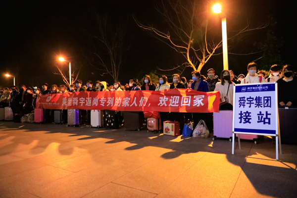 “乘坐舜宇返崗專(zhuān)列的家人們,歡迎回家。”2020年2月18日晚,高鐵余姚北站和寧波站接站口,迎接舜宇員工的橫幅格外鮮亮。三輛搭載著舜宇職工的“員工專(zhuān)列”先后抵達(dá),近300名來(lái)自周口、阜陽(yáng)、成都、貴州、南昌、上饒等地區(qū)的舜宇員工及其親屬友人在政府及公司工作人員的引導(dǎo)下,井然有序地出站。