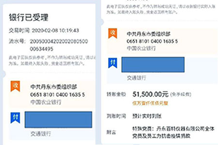 2月8日上午,丹東百特黨支部將凝聚著33名黨員和136名員工拳拳愛國之心的51500元的特殊黨費(fèi)匯到中共丹東市委組織部。市委組織部領(lǐng)導(dǎo)稱贊百特是“愛黨愛國的典范,抗擊疫情的榜樣”。