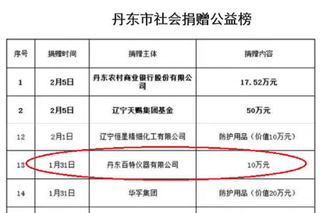 公司總經(jīng)理董青云、副總經(jīng)理劉忠蘭鼎力支持公司黨支部發(fā)起的“抗疫情,獻(xiàn)力量”捐款倡議。他們在代表公司向丹東慈善總會(huì)捐款10萬元后,指示將庫存的一百多只紅外線體溫槍捐贈(zèng)給企業(yè)和社會(huì)各界用于防控疫情,又積極參加黨支部發(fā)起的捐款活動(dòng),表現(xiàn)出了企業(yè)家胸懷國家、無私奉獻(xiàn)的情懷。