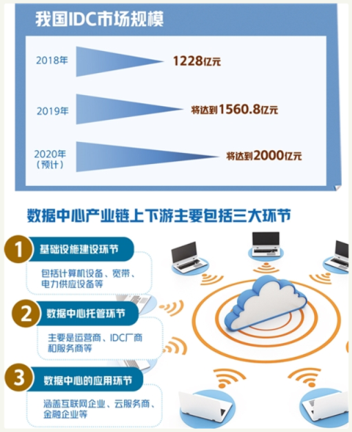 根據(jù)前瞻產(chǎn)業(yè)研究院的數(shù)據(jù),2018年我國(guó)IDC市場(chǎng)規(guī)模為1228億元,2019年將達(dá)到1560.8億元,同比增長(zhǎng)27.1%,按照該統(tǒng)計(jì)口徑,且考慮到政策支持力度的加大,預(yù)計(jì)2020年數(shù)據(jù)中心的市場(chǎng)規(guī)模將達(dá)到2000億元。