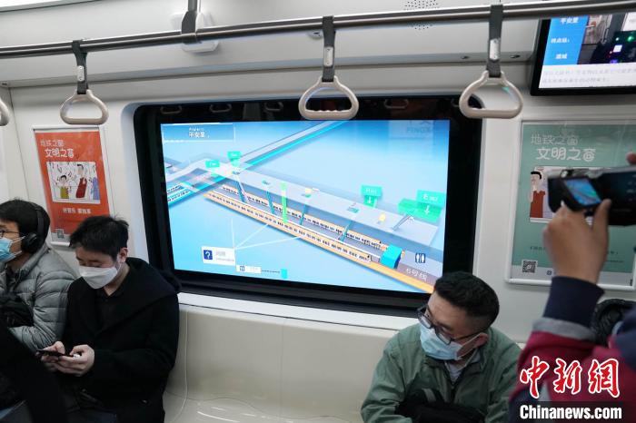 列車啟動(dòng)后,顯示全網(wǎng)運(yùn)行線路圖的車窗上,顯示出三維示意圖,讓乘客看到列車“穿行”在高樓大廈之間,也讓乘客了解到列車當(dāng)前位置、線網(wǎng)圖及前方車站出口周邊商業(yè)設(shè)施等內(nèi)容。