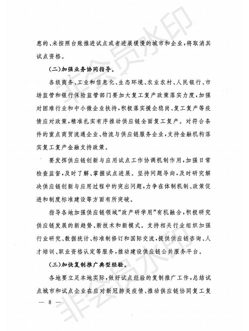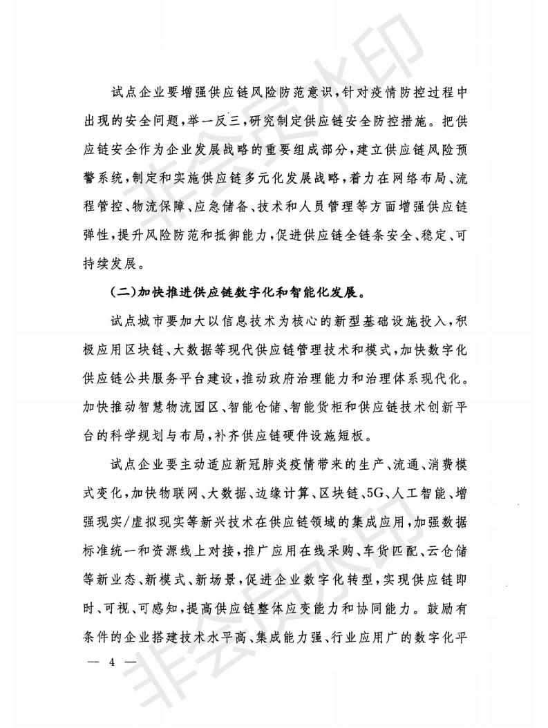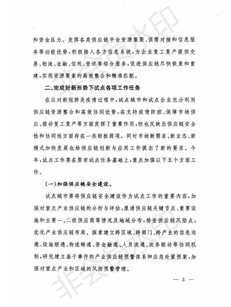 通知指出,為認(rèn)真貫徹落實(shí)打贏脫貧攻堅戰(zhàn)、全面建成小康社會重大戰(zhàn)略部署和堅持在常態(tài)化疫情防控中加快推進(jìn)生產(chǎn)生活秩序全面恢復(fù)相關(guān)要求,針對供應(yīng)鏈安全性和協(xié)同性方面存在的短板弱項(xiàng),積極應(yīng)對市場新需求、新業(yè)態(tài)、新模式加快發(fā)展給供應(yīng)鏈創(chuàng)新與應(yīng)用工作提出的新要求,要在原有試點(diǎn)任務(wù)基礎(chǔ)上,重點(diǎn)做好加強(qiáng)供應(yīng)鏈安全建設(shè)、加快推進(jìn)供應(yīng)鏈數(shù)字化和智能化發(fā)展、促進(jìn)穩(wěn)定全球供應(yīng)鏈、助力決戰(zhàn)決勝脫貧攻堅和充分利用供應(yīng)鏈金融服務(wù)實(shí)體企業(yè)等五個方面工作。