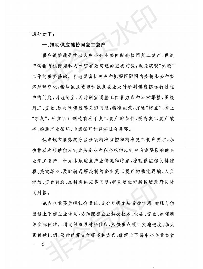 通知要求,試點(diǎn)城市要落實(shí)分區(qū)分級精準(zhǔn)防控和精準(zhǔn)復(fù)工復(fù)產(chǎn)要求,加快推動和幫助供應(yīng)鏈龍頭企業(yè)和在全球供應(yīng)鏈中有重要影響的企業(yè)復(fù)工復(fù)產(chǎn);試點(diǎn)企業(yè)要勇?lián)鐣?zé)任,充分發(fā)揮龍頭帶動作用,加強(qiáng)與供應(yīng)鏈上下游企業(yè)協(xié)同,協(xié)助配套企業(yè)解決技術(shù)、設(shè)備、資金、原輔料等實(shí)際困難。