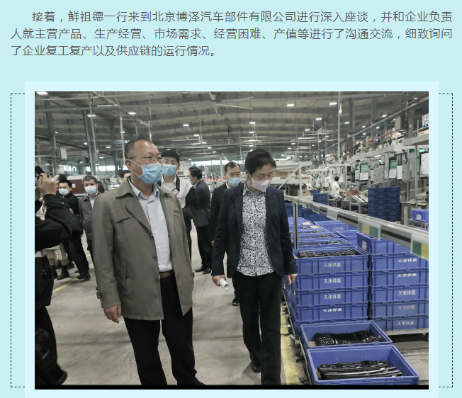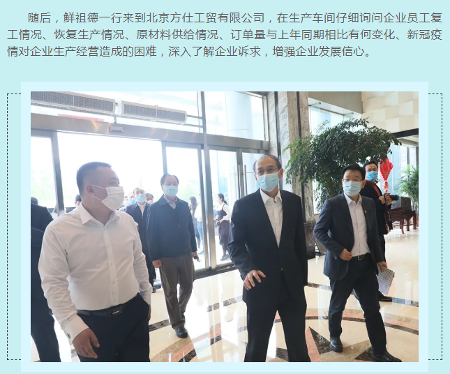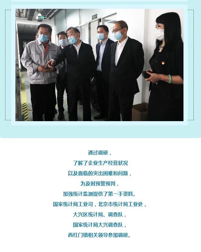 為充分發(fā)揮統(tǒng)計(jì)部門優(yōu)勢,及時客觀了解新冠疫情對小微企業(yè)的影響,進(jìn)一步把脈疫情對工業(yè)經(jīng)濟(jì)的影響程度,準(zhǔn)確把握小微工業(yè)企業(yè)的需求和期待,4月15日,國家統(tǒng)計(jì)局黨組成員、副局長鮮祖德一行深入大興區(qū)小微工業(yè)企業(yè)一線,開展現(xiàn)場調(diào)研。北京市政府副秘書長王文杰、北京市統(tǒng)計(jì)局局長蔣力歌、國家統(tǒng)計(jì)局北京調(diào)查總隊(duì)總隊(duì)長徐榮華、國家統(tǒng)計(jì)局工業(yè)司副司長張衛(wèi)華、北京市統(tǒng)計(jì)局副局長吳萬標(biāo)、大興區(qū)常務(wù)副區(qū)長高念東陪同調(diào)研。