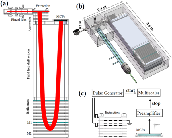 該團隊唐小鋒副研究員和溫作贏博士等人,以真空紫外放電燈作為電離源,自行設(shè)計和研制了小型真空紫外光電離反射式飛行時間質(zhì)譜儀,并將之應(yīng)用于大氣自由基反應(yīng)動力學(xué)研究。通過設(shè)計具有籠式結(jié)構(gòu)的新型聚焦電場,實現(xiàn)了電離區(qū)內(nèi)離子的高效率收集,提高了質(zhì)譜儀的檢測靈敏度(自由基靈敏度達(dá)到0.3ppb)。同時,通過采用垂直引入式結(jié)構(gòu)和二級空間聚焦等關(guān)鍵技術(shù),實現(xiàn)小型化質(zhì)譜儀高的質(zhì)譜分辨本領(lǐng)(M/△M = 2000, FWHM)。
