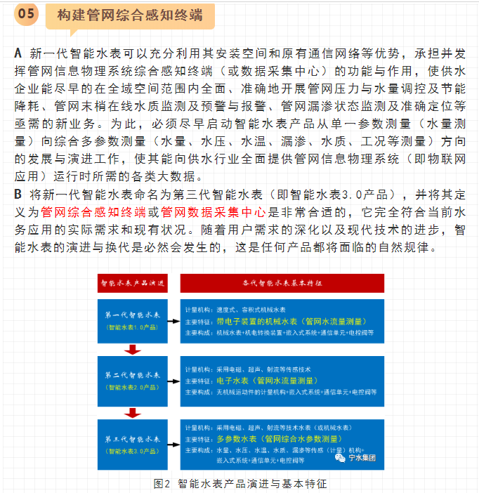 寧水集團2019年初在主板A股上市后,進一步確立了服務于智慧供水新業務的戰略方針與目標,在持續做好水表產品水計量性能提升、以NB-IoT及5G技術等為代表的無線數據遠傳業務拓展以及DMA分區計量漏損監測、水務信息化應用等工作基礎上,正在努力向供水管網數據綜合提供商和智慧供水核心業務服務商轉型與升級,其近中期目標是向供水企業提供在線一體化的高性價比管網綜合大數據感知裝置(包括:水量、水壓、水質、漏滲、水溫等參數),為智慧供水新業務及水務信息化云平臺提供海量數據支撐,使現有水力、水質、漏損、能耗等水務管網模型運行準確度能夠顯著提升。