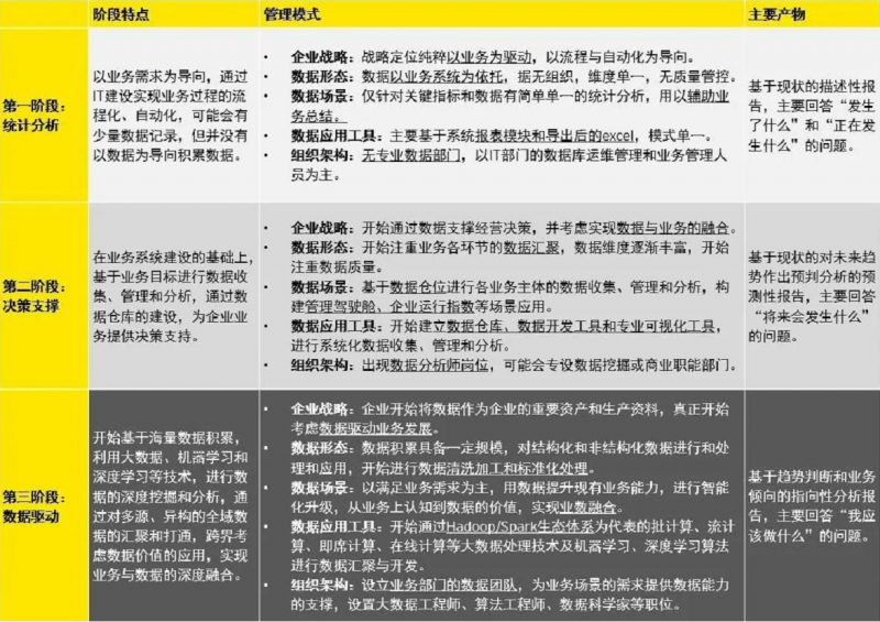 借鑒其他行業的先進管理模式,我們認為企業數據運營往往需要經歷三大階段(表三)。而作為數據化程度相對較弱的裝備制造業,需要通過前、中、后端的變革逐步實現階段性突破。